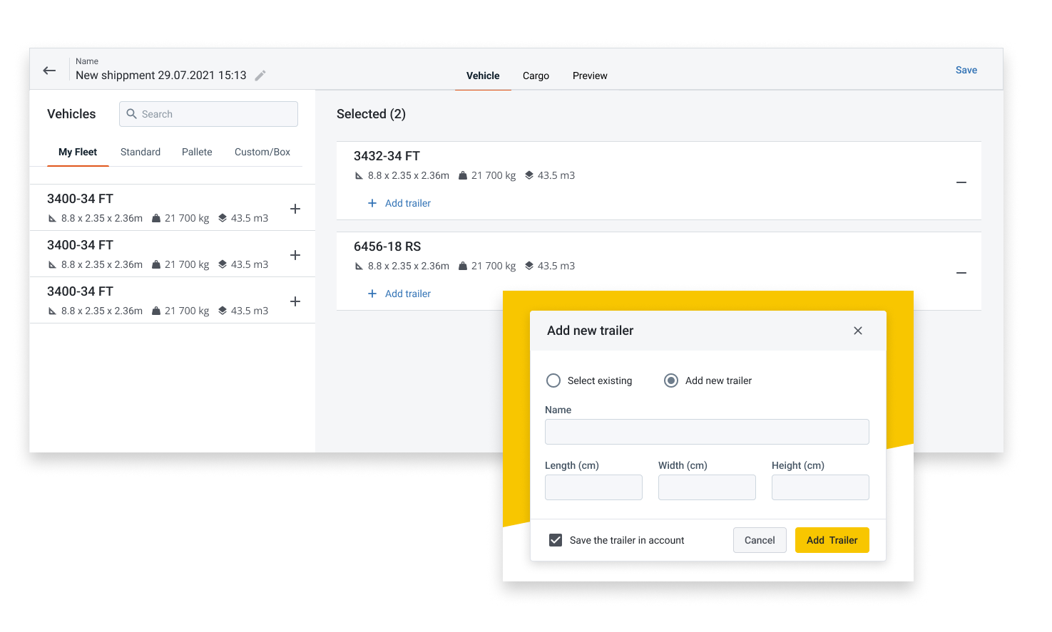 - add and adjust your own fleet to use as a preset - customize your trucks, containers, or any other transport unit you use
