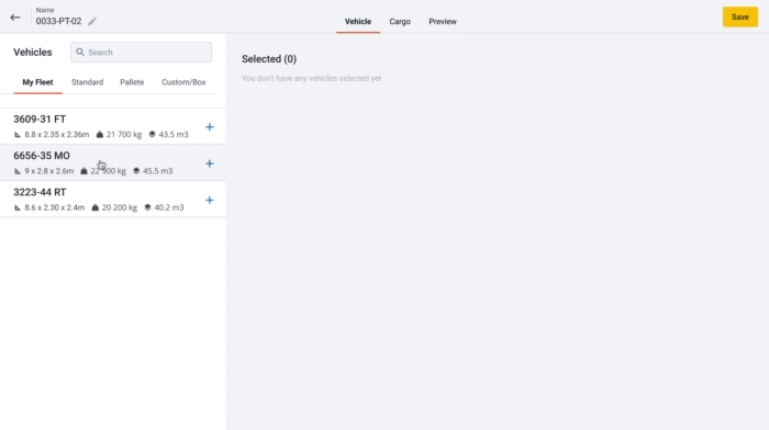 Add your own fleet, pallets and boxes,` or choose from a standard predefined list